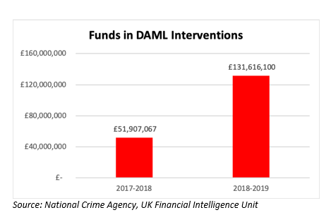 Financial regulators in the United Kingdom have similarly observed similar growth in SARs. According to the National Crime Agency, the U.K. Financial Intelligence Unit in fiscal 2018 processed a record 478,437 suspicious activity reports, a 3% increase from prior fiscal year. In addition, the UKFIU reported 34,151 requests for Defence Against Money Laundering, a more than 52% increase. DAML actions include account freezing orders, cash seizures and other asset recoveries. The amount of funds in DAML requests in fiscal 2018, £131.7 million, more than doubled from the previous year.6